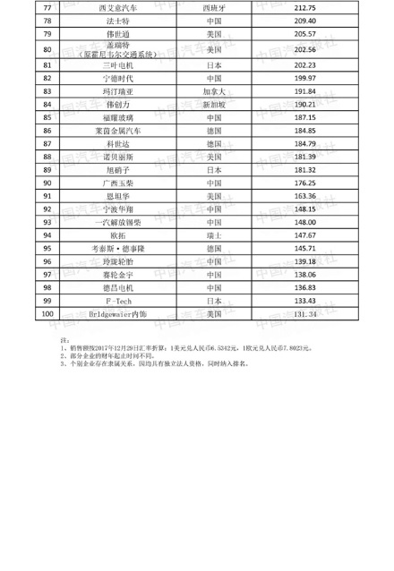 中国军团中,潍柴、华域汽车仍绝对领先,潍柴成为国内唯一一家年营收超过2000亿元的零部件企业,华域汽车2017年营收超1400亿元,两家企业的国际排名分别上升5位和1位,分别位列全球第5名和第11名,充分代表本土企业的先进力量。此外还有16家企业位居全球第37~98名,入选国际百强榜的总数量比与2017年增加了1家。