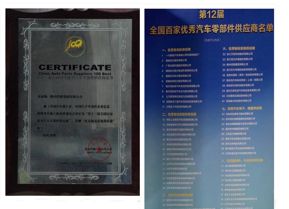 由中国汽车报社有限公司主办,中国汽车工业国际合作有限公司、法兰克福展览(上海)有限公司协办的2015中国汽车零部件发展论坛暨第12届全国百家优秀汽车零部件供应商颁奖典礼在上海国家会展中心举行。隆中控股集团有限公司荣获2015年全国百家优秀汽车零部件优秀制动系统供应商。