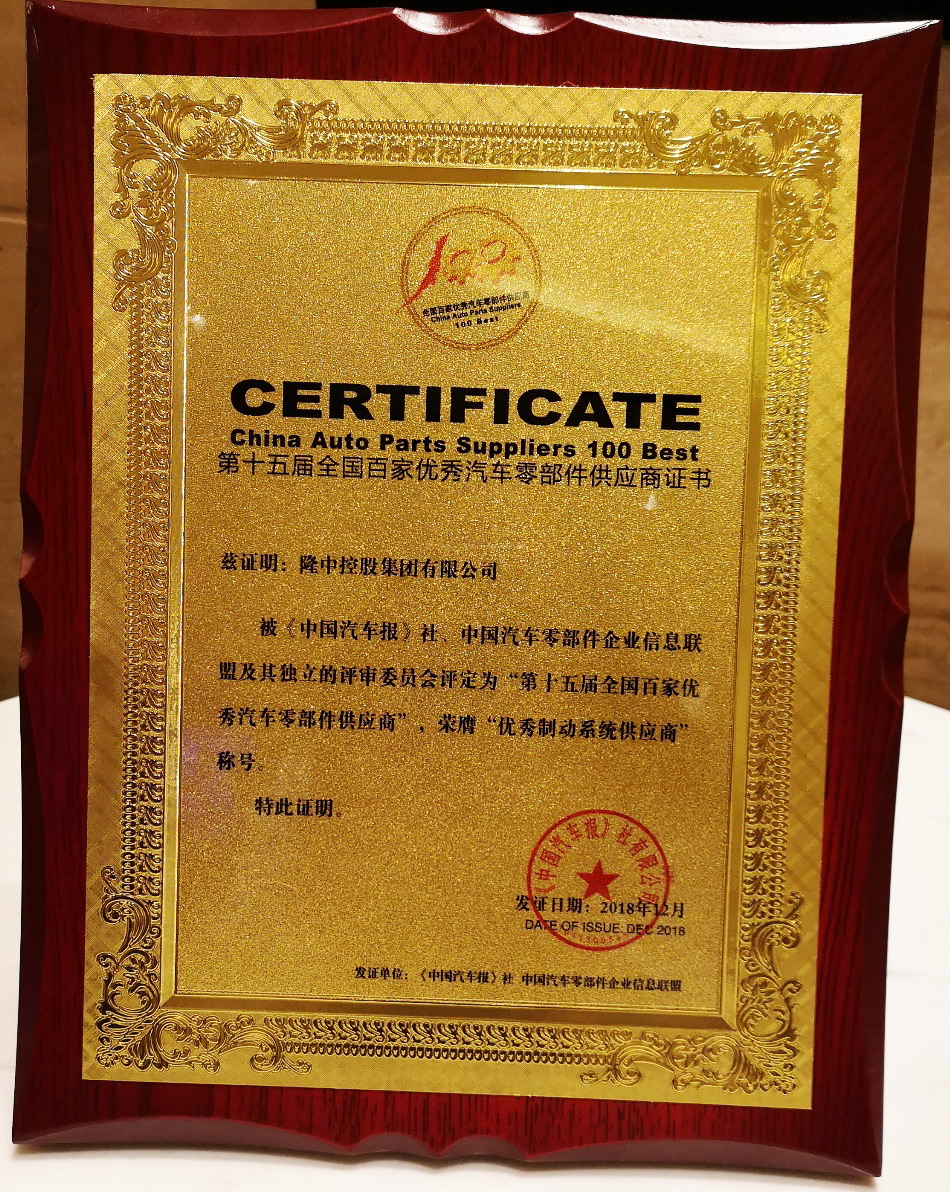 在激动热烈的颁奖环节,隆中最终荣获“优秀制动系统供应商”称号。本届百家活动受到了汽车行业、整车企业、媒体的高度关注,同时得到众多业内专家学者的大力支持,汽车零部件企业的积极参与。经过数月的层层推荐、筛选和评审,最终共有100家一级汽车零部件企业都荣获奖项。隆中控股能荣获这个奖项,正是对我司在商用车制动系统方面的努力开拓与创新的肯定与激励。